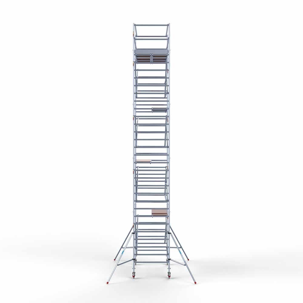 De meegeleverde rolsteiger beschikt over een werkhoogte van 10,2 meter hoogte en is ideaal voor werkzaamheden aan gevels en daken. De rolsteiger is vervaardigd uit hoogwaardig aluminium. De rolsteiger heeft een lengte van 250 cm en een breedte van 135 cm. Deze combinatie maakt het mogelijk om uw materialen op het deck te plaatsen of met meerdere personen op de steiger te staan. De rolsteiger voldoet aan alle strenge eisen omtrent veilig werken op grote hoogte en beschikt over een TÜV certificaat.