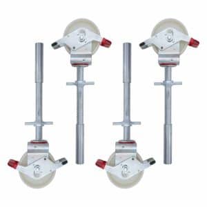 De steigerwielen van Euroscaffold beschikken over een goed werkend remsysteem, uitvalbeveiliging en zijn in hoogte verstelbaar. Voor meer stabiliteit en veiligheid is het steigerwiel met stalen spindel dubbel geremd, zowel in rol- als in zwenkrichting. De universele steigerwielen passen op alle soorten rol- en vouwsteigers van bekende gangbare merken zoals Altrex, Skyworks, Euroscaffold en Custers. De wielen zijn geschikt voor gebruik binnen en buiten, en passen op buizen van 48 en 50 mm. De wielen laten geen sporen na op vloeren. De Euroscaffold steigerwielen zijn TUV-gecertificeerd en voldoen aan de EN 1004 veiligheidseisen.