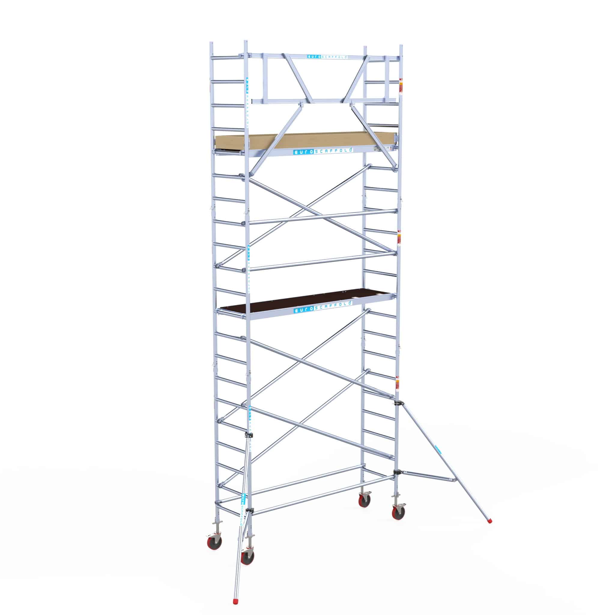 Met zekerheid en betrouwbaar klimmateriaal op hoogte werken? Dat kan met deze rolsteiger van Euroscaffold. Volledig gemaakt van aluminium met twee houten steigervloeren, een houten kantplankenset en rubber wielen.