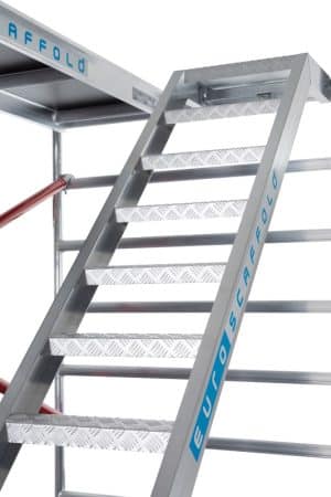 Deze steigertoren is een rolsteiger met geïntegreerde aluminium trappen met antislip treden. Snel, eenvoudig en veilig de steiger beklimmen met eventueel gereedschap of werkmaterialen in de handen. De trappen hebben leuningen aan de buitenzijde en zijn voorzien van 4 houten platformvloeren.