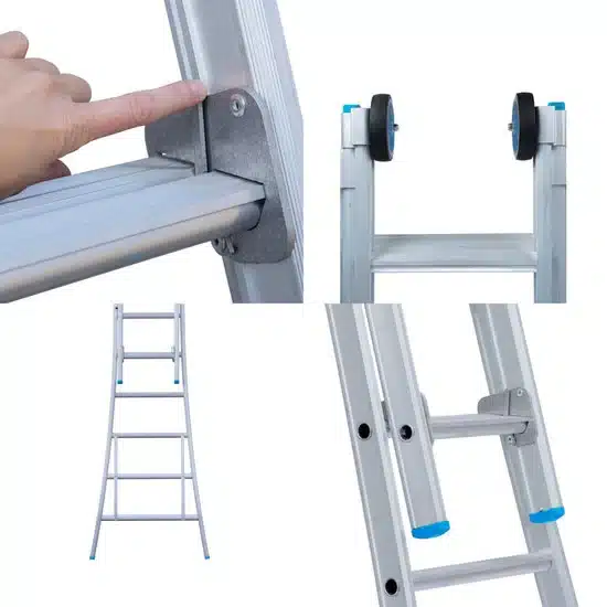 De blank aluminium uitvoering is onderhoudsvriendelijk en licht van gewicht, ideaal voor dagelijks gebruik. De modellen 2×12 t/m 2×18 zijn standaard voorzien van een stabilisatiebalk voor extra veiligheid bij grotere hoogtes.