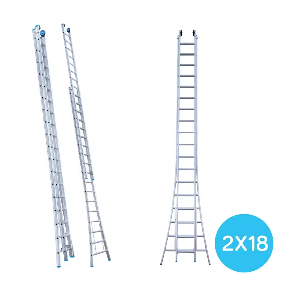 De blank aluminium uitvoering is onderhoudsvriendelijk en licht van gewicht, ideaal voor dagelijks gebruik. De modellen 2×12 t/m 2×18 zijn standaard voorzien van een stabilisatiebalk voor extra veiligheid bij grotere hoogtes.