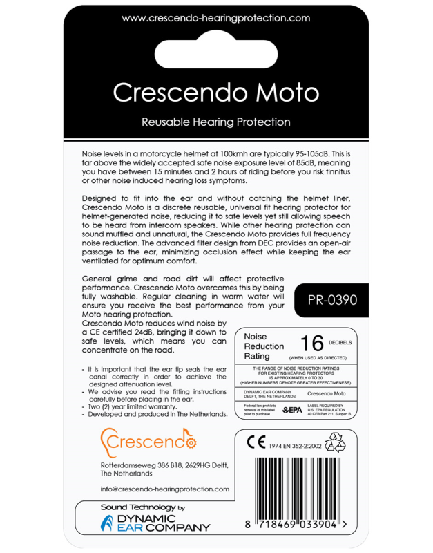 Met de Crescendo Moto oordopjes kun je genieten van je motorrit terwijl je je gehoor beschermt tegen schadelijke geluiden. Deze oordopjes zijn onopvallend en bieden een universele pasvorm, zodat ze comfortabel en veilig te dragen zijn onder je motorhelm.