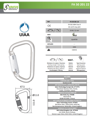 - Normconformiteit: De haak voldoet aan meerdere normen, waaronder EN362:2004 – klasse B, EN 13463-1:2009, EN 13463-5:2003, EN 12275 Class B/H, en ATEX Directive 2014/34/EU, wat getuigt van zijn hoge kwaliteit en veiligheidsstandaarden.