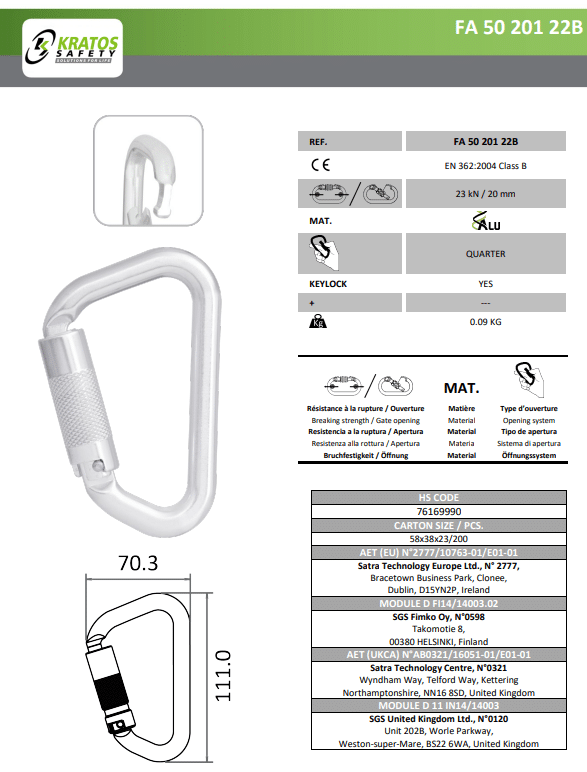 - Voldoet aan EN362:2004 – klasse B: Voldoet aan de hoogste veiligheidsnormen voor persoonlijke beschermingsmiddelen tegen vallen, waardoor de kwaliteit en betrouwbaarheid zijn gegarandeerd.