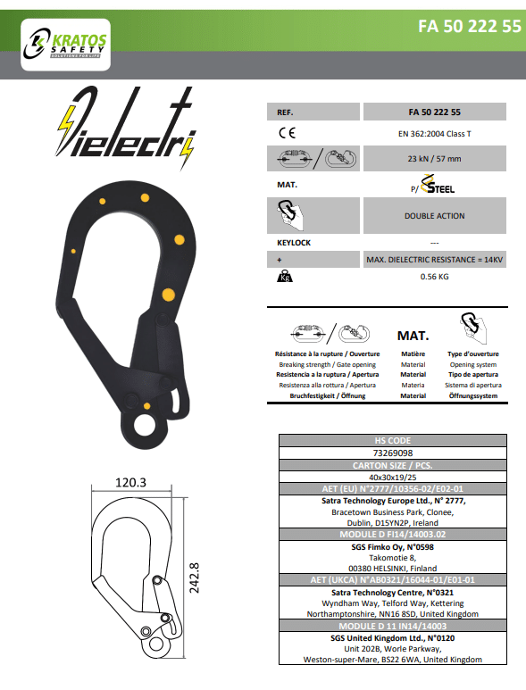 Ontdek de Kratos dielectric steigerhaak met een opening van 55 mm – FA5022255, verkrijgbaar bij RSN Safety. Hier zijn de belangrijkste kenmerken: