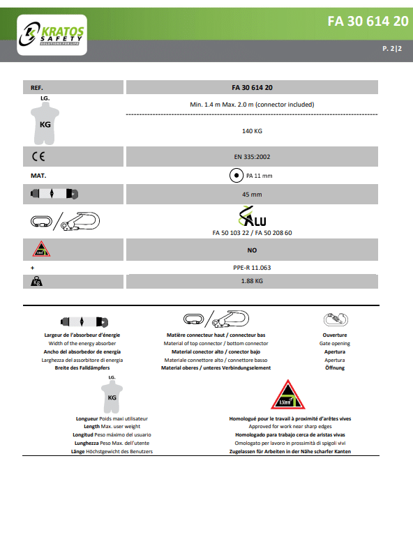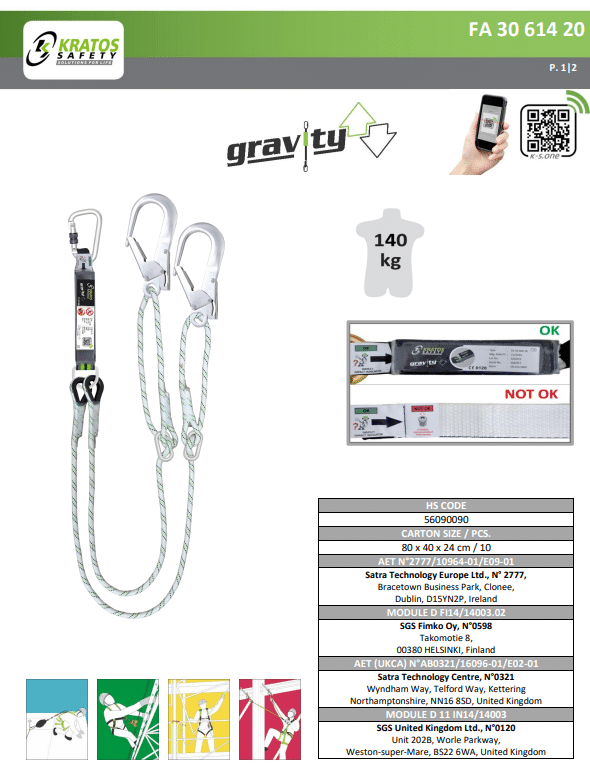 - Normconformiteit: De Kratos positioneringslijn Y-lijn voldoet aan de norm EN355:2002, wat aantoont dat het voldoet aan strenge veiligheidsnormen en geschikt is voor professioneel gebruik op hoogte.