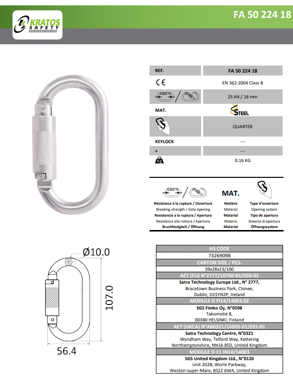 - Conformiteit met Normen: De haak voldoet aan de strenge normen van EN362:2004 – klasse B, wat de kwaliteit en betrouwbaarheid ervan bevestigt voor professioneel gebruik.