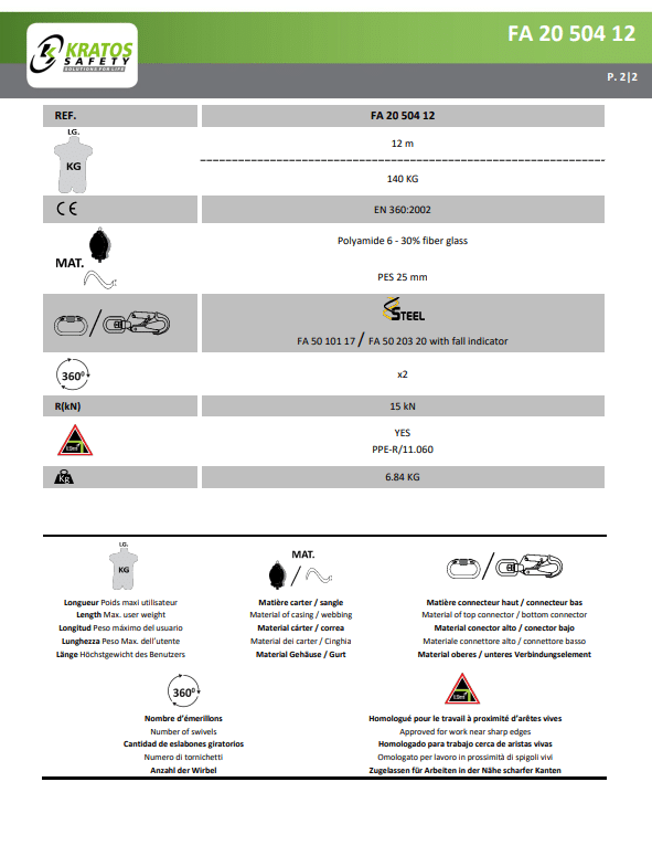 Dit valstopblok wordt geleverd met een wartel en koppelstuk (FA5010117) en een connector met valindicator (FA5020320), waardoor het gemakkelijk te bevestigen is aan harnassen of ankerpunten. Het is voorzien van een automatisch terugtreksysteem en een geïntegreerd remsysteem dat voldoet aan een slagkracht van minder dan 6 kN, waardoor de veiligheid van de gebruiker wordt gewaarborgd.