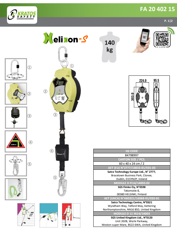 Dit valstopblok is voorzien van een wartel en koppelstuk (FA5010117) en een connector met valindicator (FA5020320) voor eenvoudige bevestiging aan harnassen of ankerpunten. Het beschikt over een automatisch terugtreksysteem en een remsysteem dat de impact van een val kan verminderen tot minder dan 6 kN, wat de veiligheid van de gebruiker waarborgt.