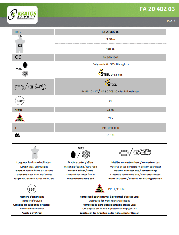 - Wartel en Koppelstuk: Uitgerust met een wartel en koppelstuk (FA5010117) voor een soepele rotatie en gemakkelijke bevestiging aan het harnas van de gebruiker.