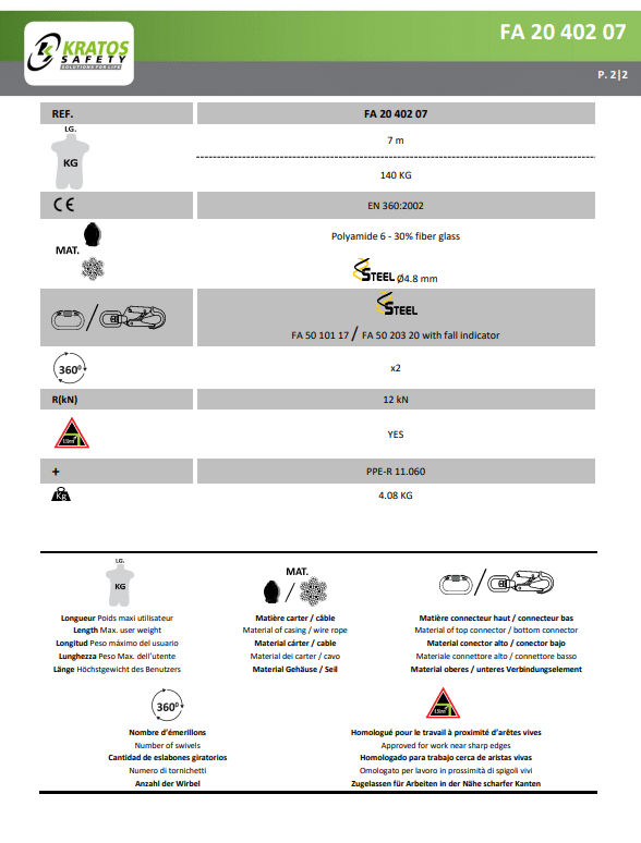 Ontdek het Kratos valstopblok 7m staalkabel – FA2040207, verkrijgbaar bij RSN Safety. Dit zelf oprollende valstopblok biedt optimale valbescherming voor gebruikers die werken op hoogten, met een maximale lengte van 7 meter.