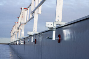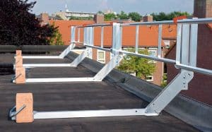 Het RSS Roof systeem voor het platte dak onderscheidt zich door zijn eenvoud. Het is licht en makkelijk op te bouwen. De staander voor het platte dak wordt uit elkaar gevouwen en met een borgpen vastgezet. De staander wordt geballast met een contragewicht. Vervolgens wordt het hekwerk in de staander gehangen en gezekerd door de klemhaken.