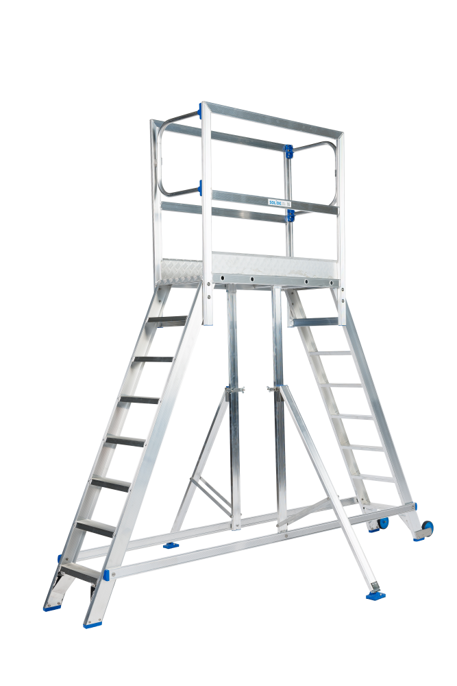 Ervaar het gemak en de veiligheid van ons mobiele werkplatform met dubbele toegang. Dankzij de twee regelbare stabilisatoren met pivoterende voeten is dit platform super stabiel, zelfs op ongelijke ondergronden.